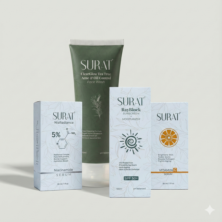Includes Nicinamide Serum + Vitamin C or HA + AR Serum + Any Facewash + Sunscreen + Moisturizer. Covers cleansing, brightening, hydration, and protection in one premium bundle.